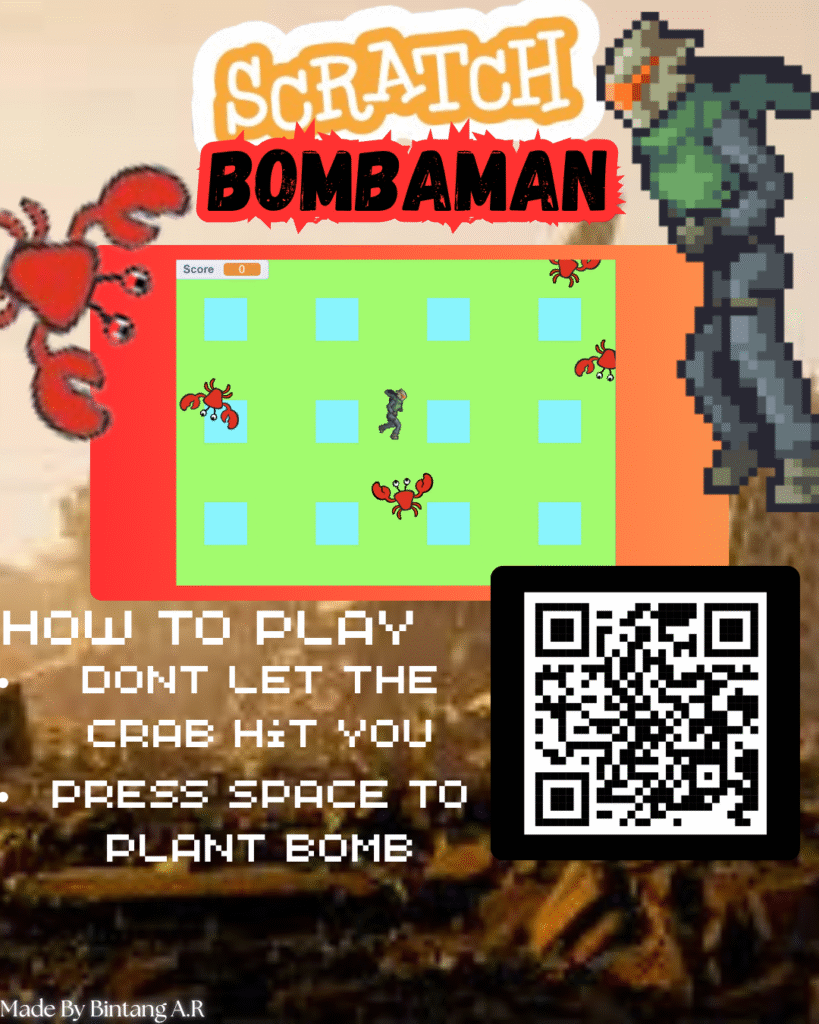 So,I made this game in scratch and i made Bombaman poster too.As you can see here i have made the game and the poster,In the poster there is Scratch logo,Bombaman title,How to play Bombaman,Qr Scan code And some decoration.